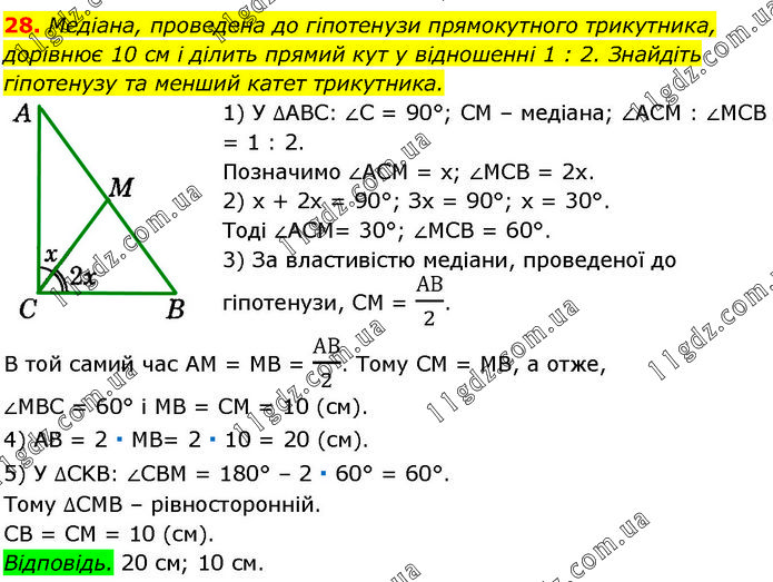 Медіана, проведена до гіпотенузи прямокутного трикутника, дорівнює 10 см і ділить прямий кут у відношенні 1 : 2. Знайдіть гіпотенузу та менший катет трикутника. 1) У ∆ABC: ∠C = 90°; CM – медіана; ∠ACM : ∠MCB = 1 : 2. Позначимо ∠ACM = х; ∠MCB = 2х. 2) х + 2х = 90°; Зх = 90°; х = 30°. Тоді ∠ACM = 30°; ∠MCB = 60°. 3) За властивістю медіани, проведеної до гіпотенузи, CM = АВ/2. В той самий час AM = MB = АВ/2. Тому CM = MB, а отже, ∠MBC = 60° і MB = CM = 10 (см). 4) AB = 2 ∙ MB = 2 ∙ 10 = 20 (см). 5) У ∆CKB: ∠CBM = 180° – 2 ∙ 60° = 60°. Тому ∆CMB – рівносторонній. CB = CM = 10 (см). Відповідь. 20 см; 10 см.