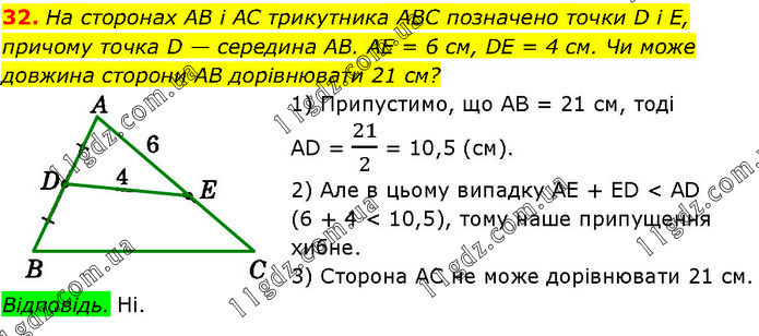 На сторонах AB і AC трикутника ABC позначено точки D і Е, причому точка D — середина AB. AE = 6 см, DE = 4 см. Чи може довжина сторони AB дорівнювати 21 см? 1) Припустимо, що AB = 21 см, тоді AD = 21/2 = 10,5 (см). 2) Але в цьому випадку AE + ED < AD (6 + 4 < 10,5), тому наше припущення хибне. 3) Сторона AC не може дорівнювати 21 см. Відповідь. Ні.
