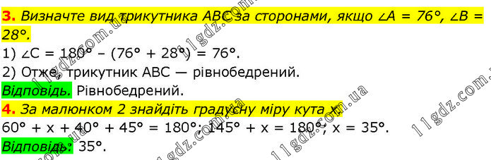 3. Визначте вид трикутника ABC за сторонами, якщо ∠A = 76°, ∠B = 28°. 1) ∠C = 180° – (76° + 28°) = 76°. 2) Отже, трикутник ABC — рівнобедрений. Відповідь. Рівнобедрений. 4. За малюнком 2 знайдіть градусну міру кута х. 60° + х + 40° + 45° = 180°; 145° + х = 180°; х = 35°. Відповідь: 35°.