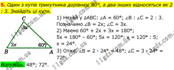 Один з кутів трикутника дорівнює 60°, а два інших відносяться як 2 : 3. Знайдіть ці кути. 1) Нехай у ∆АBC: ∠A = 60°; ∠B : ∠C = 2 : 3. Позначимо ∠B = 2х; ∠C = Зх. 2) Маємо 60° + 2х + Зх = 180°; 5х = 180° – 60°; 5х = 120°; х = 120° : 5; х = 24°. 3) Отже, ∠B = 2 ∙ 24° = 48°; ∠C = 3 ∙ 24° = 72°. Відповідь. 48°; 72°.