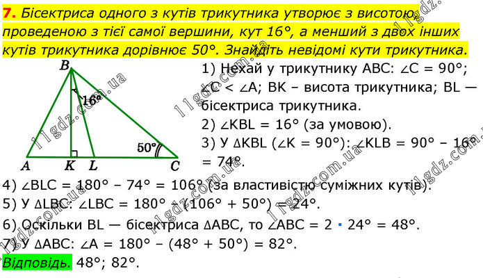 Бісектриса одного з кутів трикутника утворює з висотою, проведеною з тієї самої вершини, кут 16°, а менший з двох інших кутів трикутника дорівнює 50°. Знайдіть невідомі кути трикутника. 1) Нехай у трикутнику ABC: ∠C = 90°; ∠C < ∠A; BK – висота трикутника; BL — бісектриса трикутника. 2) ∠KBL = 16° (за умовою). 3) У ∆KBL (∠K = 90°): ∠KLB = 90° – 16° = 74°. 4) ∠BLC = 180° – 74° = 106° (за властивістю суміжних кутів). 5) У ∆LBC: ∠LBC = 180° – (106° + 50°) = 24°. 6) Оскільки BL — бісектриса ∆ABC, то ∠ABC = 2 ∙ 24° = 48°. 7) У ∆ABC: ∠A = 180° – (48° + 50°) = 82°. Відповідь. 48°; 82°.