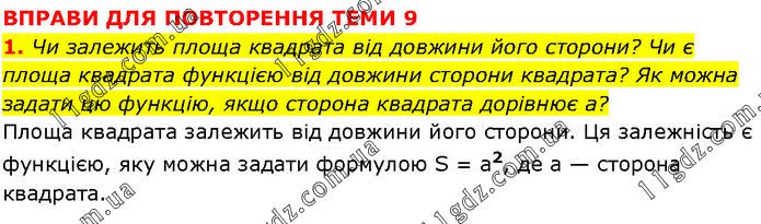 ВПРАВИ ДЛЯ ПОВТОРЕННЯ ТЕМИ 9 1. Чи залежить площа квадрата від довжини його сторони? Чи є площа квадрата функцією від довжини сторони квадрата? Як можна задати цю функцію, якщо сторона квадрата дорівнює а? Площа квадрата залежить від довжини його сторони. Ця залежність є функцією, яку можна задати формулою S = а2, де а — сторона квадрата.