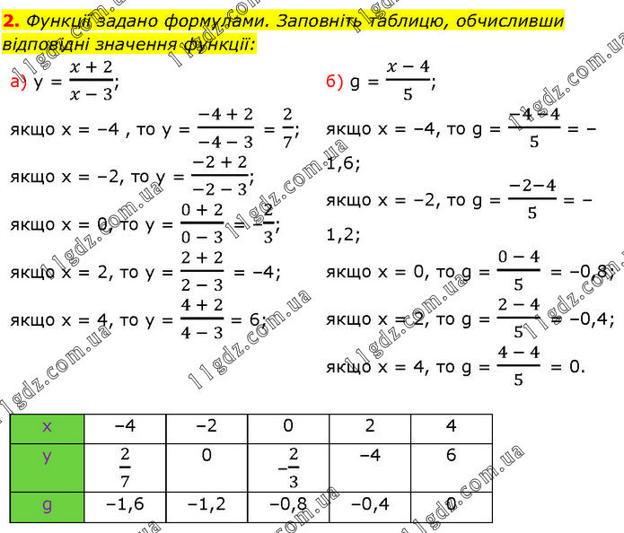 Функції задано формулами. Заповніть таблицю, обчисливши відповідні значення функції: a) у = (x + 2)/(x - 3); якщо х = –4 , то у = (-4 + 2)/(-4 - 3) = 2/7; якщо х = –2, то y = (-2 + 2)/(-2 - 3); якщо х = 0, то у = (0 + 2)/(0 - 3) = –2/3; якщо х = 2, то у = (2 + 2)/(2 - 3) = –4; якщо х = 4, то у = (4 + 2)/(4 - 3) = 6; б) g = (x - 4)/5; якщо х = –4, то g = (-4 -4)/5 = –1,6; якщо х = –2, то g = (-2-4)/5 = –1,2; якщо х = 0, то g = (0 - 4)/5 = –0,8; якщо х = 2, то g = (2 - 4)/5 = –0,4; якщо х = 4, то g = (4 - 4)/5 = 0.