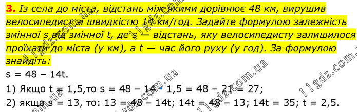 Із села до міста, відстань між якими дорівнює 48 км, вирушив велосипедист зі швидкістю 14 км/год. Задайте формулою залежність змінної s від змінної t, де s — відстань, яку велосипедисту залишилося проїхати до міста (у км), a t — час його руху (у год). За формулою знайдіть: s = 48 – 14t. 1) Якщо t = 1,5,то s = 48 – 14 ∙ 1,5 = 48 – 21 = 27; 2) якщо s = 13, то: 13 = 48 – 14t; 14t = 48 – 13; 14t = 35; t = 2,5.