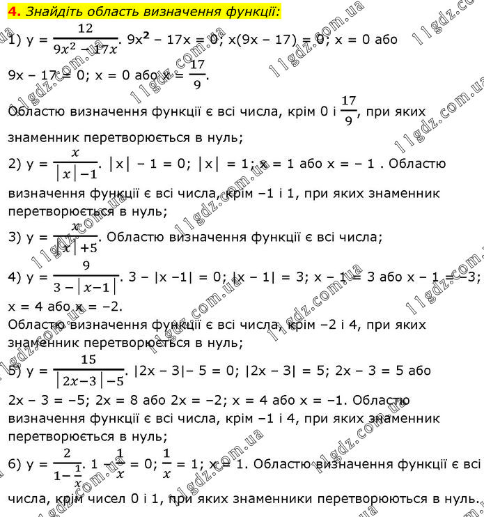 Знайдіть область визначення функції: 1) у = 12/(〖9x〗^2 - 17x). 9х2 – 17х = 0; х(9х – 17) = 0; х = 0 або 9х – 17 = 0; х = 0 або х = 17/9. Областю визначення функції є всі числа, крім 0 і 17/9, при яких знаменник перетворюється в нуль; 2) у = x/(│x│-1). │x│ – 1 = 0; │x│ = 1; x = 1 або x = – 1 . Областю визначення функції є всі числа, крім –1 і 1, при яких знаменник перетворюється в нуль; 3) у = x/(│x│+ 5). Областю визначення функції є всі числа; 4) у = 9/(3 -│x-1│). 3 – |x –1| = 0; |х – 1| = 3; х – 1 = 3 або х – 1 = –3; х = 4 або х = –2. Областю визначення функції є всі числа, крім –2 і 4, при яких знаменник перетворюється в нуль; 5) у = 15/(│2x-3│-5). |2х – З|– 5 = 0; |2х – З| = 5; 2х – 3 = 5 або 2х – 3 = –5; 2х = 8 або 2х = –2; x = 4 або х = –1. Областю визначення функції є всі числа, крім –1 і 4, при яких знаменник перетворюється в нуль; 6) у = 2/(1- 1/x). 1 – 1/x = 0; 1/x = 1; x = 1. Областю визначення функції є всі числа, крім чисел 0 і 1, при яких знаменники перетворюються в нуль.