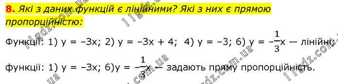 Які з даних функцій є лінійними? Які з них є прямою пропорційністю: Функції: 1) у = –Зх; 2) у = –Зх + 4; 4) у = –3; 6) у = –1/3х — лінійні; функції: 1) у = –Зх; 6)у = –1/3х — задають пряму пропорційність.