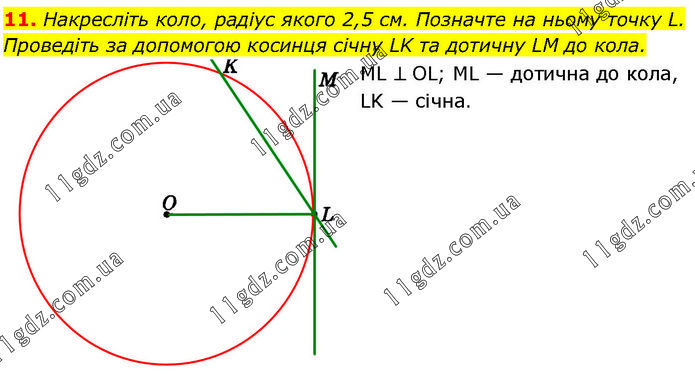 Накресліть коло, радіус якого 2,5 см. Позначте на ньому точку L. Проведіть за допомогою косинця січну LK та дотичну LM до кола. ML ⊥ OL; ML — дотична до кола, LK — січна.