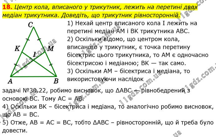 Центр кола, вписаного у трикутник, лежить на перетині двох медіан трикутника. Доведіть, що трикутник рівносторонній. 1) Нехай центр вписаного кола І лежить на перетині медіан AM і BK трикутника ABC. 2) Оскільки відомо, що центром кола, вписаного у трикутник, є точка перетину бісектрис цього трикутника, то AM є одночасно бісектрисою і медіаною; BK — так само. 3) Оскільки AM – бісектриса і медіана, то використовуючи наслідок задачі №30.22, робимо висновок, що ∆ABC — рівнобедрений з основою BC. Тому AC = AB. 4) Оскільки BK – бісектриса і медіана, то аналогічно робимо висновок, що AB = BC. 5) Отже, AB = AC = BC, тобто ∆ABC – рівносторонній, що й треба було довести.