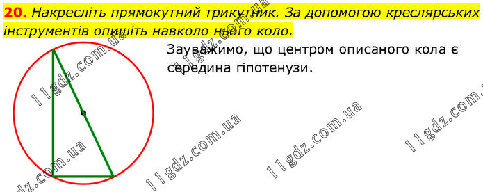 Накресліть прямокутний трикутник. За допомогою креслярських інструментів опишіть навколо нього коло. Зауважимо, що центром описаного кола є середина гіпотенузи.