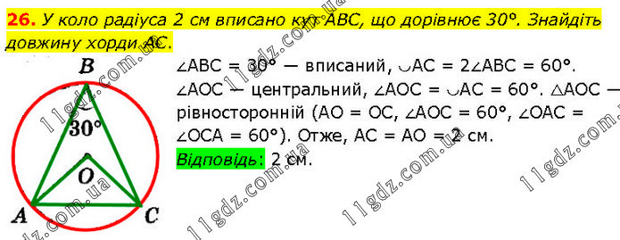 У коло радіуса 2 см вписано кут ABC, що дорівнює 30°. Знайдіть довжину хорди AC. ∠АВС = 30° — вписаний, ◡АС = 2∠АВС = 60°. ∠АОС — центральний, ∠АОС = ◡АС = 60°. △АОС — рівносторонній (АО = ОС, ∠АОС = 60°, ∠ОАС = ∠ОСА = 60°). Отже, АС = АО = 2 см. Відповідь: 2 см.