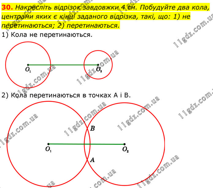 Накресліть відрізок завдовжки 4 см. Побудуйте два кола, центрами яких є кінці заданого відрізка, такі, що: 1) не перетинаються; 2) перетинаються. 1) Кола не перетинаються. 2) Кола перетинаються в точках А і В.
