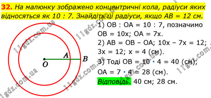 На малюнку зображено концентричні кола, радіуси яких відносяться як 10 : 7. Знайдіть ці радіуси, якщо AB = 12 см. 1) OB : OA = 10 : 7, позначимо OB = 10х; OA = 7x. 2) AB = OB – OA; 10x – 7x = 12; 3x = 12; x = 4 (см). 3) Тоді OB = 10 ∙ 4 = 40 (см); OA = 7 ∙ 4 = 28 (см). Відповідь. 40 см; 28 см.