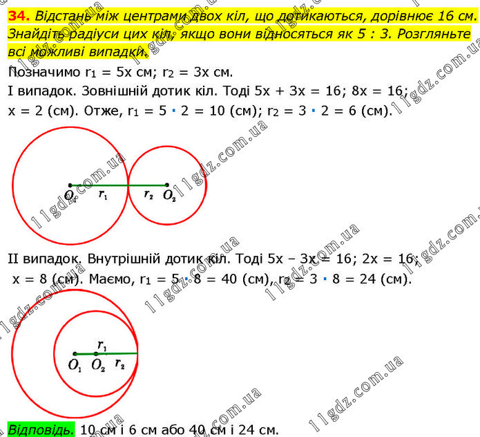 Відстань між центрами двох кіл, що дотикаються, дорівнює 16 см. Знайдіть радіуси цих кіл, якщо вони відносяться як 5 : 3. Розгляньте всі можливі випадки. Позначимо r1 = 5x см; r2 = 3x см. І випадок. Зовнішній дотик кіл. Тоді 5х + Зх = 16; 8х = 16; х = 2 (см). Отже, r1 = 5 ∙ 2 = 10 (см); r2 = 3 ∙ 2 = 6 (см). ІІ випадок. Внутрішній дотик кіл. Тоді 5х – Зх = 16; 2х = 16; х = 8 (см). Маємо, r1 = 5 ∙ 8 = 40 (см), r2 = 3 ∙ 8 = 24 (см). Відповідь. 10 см і 6 см або 40 см і 24 см.