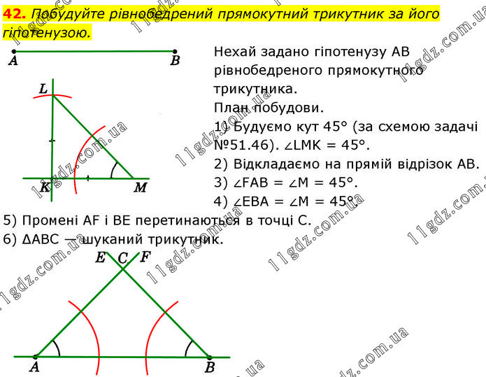 Побудуйте рівнобедрений прямокутний трикутник за його гіпотенузою. Нехай задано гіпотенузу AB рівнобедреного прямокутного трикутника. План побудови. 1) Будуємо кут 45° (за схемою задачі №51.46). ∠LMK = 45°. 2) Відкладаємо на прямій відрізок AB. 3) ∠FAB = ∠M = 45°. 4) ∠EBA = ∠M = 45°. 5) Промені AF і BE перетинаються в точці С. 6) ΔABC — шуканий трикутник.