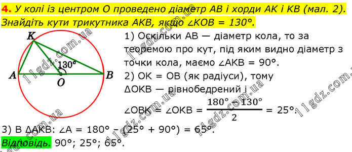 У колі із центром O проведено діаметр AB і хорди AK і KB (мал. 2). Знайдіть кути трикутника AKB, якщо ∠KOB = 130°. 1) Оскільки AB — діаметр кола, то за теоремою про кут, під яким видно діаметр з точки кола, маємо ∠AKB = 90°. 2) OK = OB (як радіуси), тому ∆OKB — рівнобедрений і ∠OBK = ∠OKB = (180° - 130°)/2 = 25°. 3) В ∆AKB: ∠A = 180° – (25° + 90°) = 65°. Відповідь. 90°; 25°; 65°.