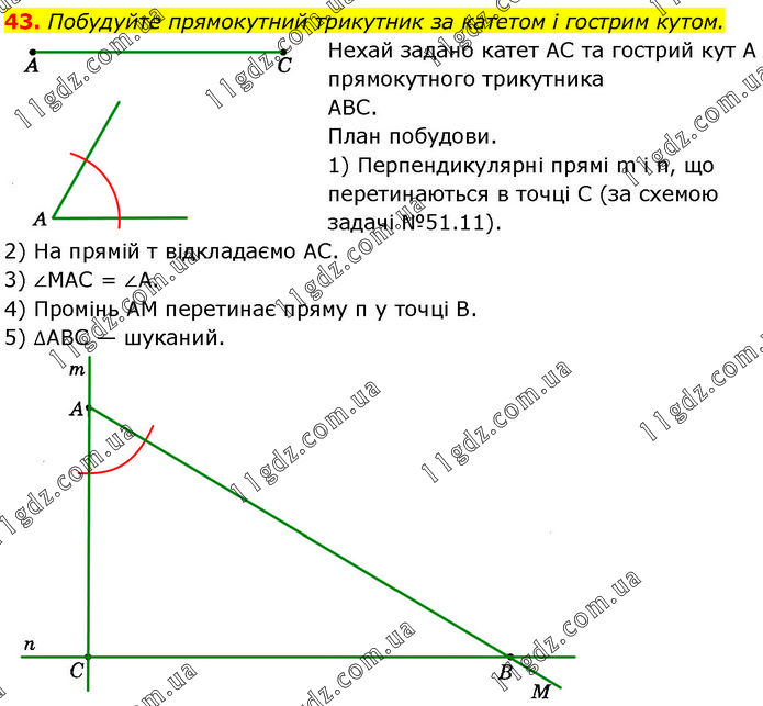 Побудуйте прямокутний трикутник за катетом і гострим кутом. Нехай задано катет AC та гострий кут А прямокутного трикутника ABC. План побудови. 1) Перпендикулярні прямі m і n, що перетинаються в точці C (за схемою задачі №51.11). 2) На прямій т відкладаємо АС. 3) ∠MAC = ∠A. 4) Промінь AM перетинає пряму п у точці В. 5) ∆ABC — шуканий.