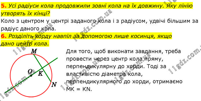 5. Усі радіуси кола продовжили зовні кола на їх довжину. Яку лінію утворять їх кінці? Коло з центром у центрі заданого кола і з радіусом, удвічі більшим за радіус даного кола. 6. Розділіть хорду навпіл за допомогою лише косинця, якщо дано центр кола. Для того, щоб виконати завдання, треба провести через центр кола пряму, перпендикулярну до хорди. Тоді за властивістю діаметра кола, перпендикулярного до хорди, отримаємо MK = KN.
