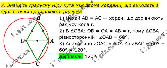 Знайдіть градусну міру кута між двома хордами, що виходять з однієї точки і дорівнюють радіусу. 1) Нехай AB = AC — хорди, що дорівнюють радіусу кола r. 2) В ∆OBA: OB = OA = AB = r, тому ∆OBA — рівносторонній і ∠OAB = 60°. 3) Аналогічно ∠OAC = 60°. 4) ∠BAC = 60° + 60° = 120°. Відповідь. 120°.