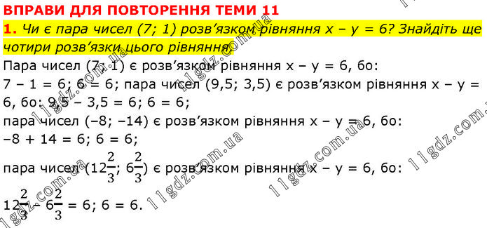 ВПРАВИ ДЛЯ ПОВТОРЕННЯ ТЕМИ 11 1. Чи є пара чисел (7; 1) розв’язком рівняння х – у = 6? Знайдіть ще чотири розв’язки цього рівняння. Пара чисел (7; 1) є розв’язком рівняння х – у = 6, бо: 7 – 1 = 6; 6 = 6; пара чисел (9,5; 3,5) є розв’язком рівняння х – у = 6, бо: 9,5 – 3,5 = 6; 6 = 6; пара чисел (–8; –14) є розв’язком рівняння х – у = 6, бо: –8 + 14 = 6; 6 = 6; пара чисел (122/3; 62/3) є розв’язком рівняння x – у = 6, бо: 122/3 – 62/3 = 6; 6 = 6.
