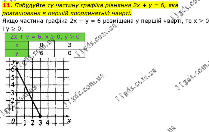 Побудуйте ту частину графіка рівняння 2х + у = 6, яка розташована в першій координатній чверті. Якщо частина графіка 2х + у = 6 розміщена у першій чверті, то х ≥ 0 і у ≥ 0.