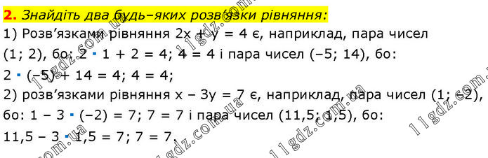Знайдіть два будь–яких розв’язки рівняння: 1) Розв’язками рівняння 2x + у = 4 є, наприклад, пара чисел (1; 2), бо: 2 ∙ 1 + 2 = 4; 4 = 4 і пара чисел (–5; 14), бо: 2 ∙ (–5) + 14 = 4; 4 = 4; 2) розв’язками рівняння х – Зу = 7 є, наприклад, пара чисел (1; –2), бо: 1 – 3 ∙ (–2) = 7; 7 = 7 і пара чисел (11,5; 1,5), бо: 11,5 – 3 ∙ 1,5 = 7; 7 = 7.