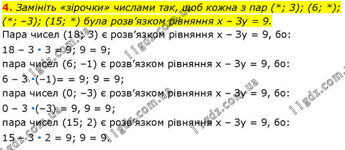 Замініть «зірочки» числами так, щоб кожна з пар (*; 3); (6; *); (*; –3); (15; *) була розв’язком рівняння х – Зу = 9. Пара чисел (18; 3) є розв’язком рівняння х – Зу = 9, бо: 18 – 3 ∙ 3 = 9; 9 = 9; пара чисел (6; –1) є розв’язком рівняння х – Зу = 9, бо: 6 – 3 ∙(–1)= = 9; 9 = 9; пара чисел (0; –3) є розв’язком рівняння х – Зу = 9, бо: 0 – 3 ∙(–3) = 9, 9 = 9; пара чисел (15; 2) є розв’язком рівняння х – Зу = 9, бо: 15 – 3 ∙ 2 = 9; 9 = 9.
