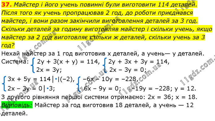 Майстер і його учень повинні були виготовити 114 деталей. Після того як учень пропрацював 2 год, до роботи приєднався майстер, і вони разом закінчили виготовлення деталей за 3 год. Скільки деталей за годину виготовляв майстер і скільки учень, якщо майстер за 2 год виготовляє стільки ж деталей, скільки учень за 3 год? Нехай майстер за 1 год виготовив х деталей, а учень— у деталей. Система: