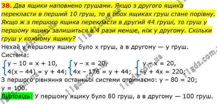 Два ящики наповнено грушами. Якщо з другого ящика перекласти в перший 10 груш, то в обох ящиках груш стане порівну. Якщо ж з першого ящика перекласти в другий 44 груші, то груш у першому ящику залишиться в 4 рази менше, ніж у другому. Скільки груш у кожному ящику? Нехай у першому ящику було х груш, а в другому — у груш. Система: