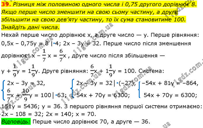 Різниця між половиною одного числа і 0,75 другого дорівнює 8. Якщо перше число зменшити на свою сьому частину, а друге збільшити на свою дев’яту частину, то їх сума становитиме 100. Знайдіть дані числа. Нехай перше число дорівнює х, а друге число — у. Перше рівняння: 0,5х – 0,75y = 8 |∙4; 2х – 3у = 32. Перше число після зменшення дорівнює: х – 1/7 х = 6/7х , друге число після збільшення — у + 1/9у = 11/9у. Друге рівняння: 6/7х + 11/9у = 100. Система: