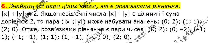Знайдіть усі пари цілих чисел, які є розв’язками рівняння. |x| + |y| = 2. Якщо невід’ємні числа |x| і |у| є цілими і ї сума дорівнює 2, то пара (|х|;|y|) може набувати значень: (0; 2); (1; 1); (2; 0). Отже, розв’язками рівняння є пари чисел: (0; 2); (0; –2), (–1; 1); (–1; –1); (1; 1); (1; –1); (–2 ; 0); (2; 0).
