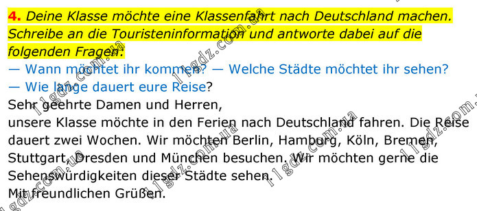 Deine Klasse möchte eine Klassenfahrt nach Deutschland machen. Schreibe an die Touristeninformation und antworte dabei auf die folgenden Fragen: — Wann möchtet ihr kommen? — Welche Städte möchtet ihr sehen? — Wie lange dauert eure Reise? Sehr geehrte Damen und Herren, unsere Klasse möchte in den Ferien nach Deutschland fahren. Die Reise dauert zwei Wochen. Wir möchten Berlin, Hamburg, Köln, Bremen, Stuttgart, Dresden und München besuchen. Wir möchten gerne die Sehenswürdigkeiten dieser Städte sehen. Mit freundlichen Grüßen.