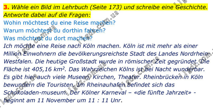 Wähle ein Bild im Lehrbuch (Seite 173) und schreibe eine Geschichte. Antworte dabei auf die Fragen: Wohin möchtest du eine Reise machen? Warum möchtest du dorthin fahren? Was möchtest du dort machen? Ich möchte eine Reise nach Köln machen. Köln ist mit mehr als einer Million Einwohnern die bevölkerungsreichste Stadt des Landes Nordrhein-Westfalen. Die heutige Großstadt wurde in römischer Zeit gegründet. Die Fläche ist 405,16 km2. Das Wahrzeichen Kölns ist bei Nacht wunderbar. Es gibt hier auch viele Museen, Kirchen, Theater. Rheinbrücken in Köln bewundern die Touristen. Im Rheinauhafen befindet sich das Schokoladen-museum. Der Kölner Karneval – «die fünfte Jahrzeit» - beginnt am 11 November um 11 : 11 Unr.