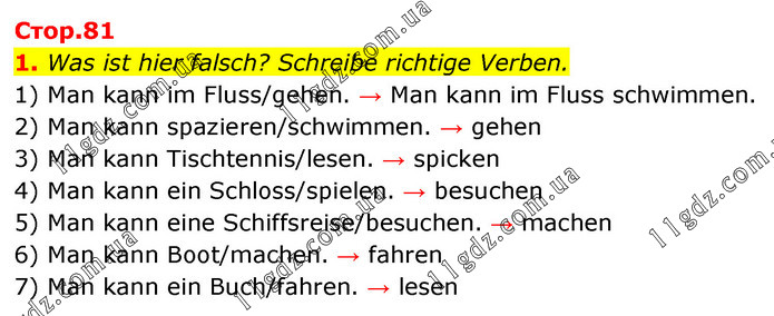 Was ist hier falsch? Schreibe richtige Verben. 1) Man kann im Fluss/gehen. → Man kann im Fluss schwimmen. 2) Man kann spazieren/schwimmen. → gehen 3) Man kann Tischtennis/lesen. → spicken 4) Man kann ein Schloss/spielen. → besuchen 5) Man kann eine Schiffsreise/besuchen. → machen 6) Man kann Boot/machen. → fahren 7) Man kann ein Buch/fahren. → lesen