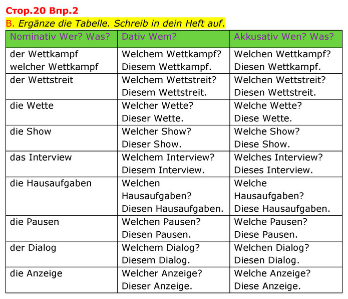 B. Ergänze die Tabelle. Schreib in dein Heft auf. Nominativ Wer? Was? Dativ Wem? Akkusativ Wen? Was? der Wettkampf welcher Wettkampf Welchem Wettkampf? Diesem Wettkampf. Welchen Wettkampf? Diesen Wettkampf. der Wettstreit Welchem Wettstreit? Diesem Wettstreit. Welchen Wettstreit? Diesen Wettstreit. die Wette Welcher Wette? Dieser Wette. Welche Wette? Diese Wette. die Show Welcher Show? Dieser Show. Welche Show? Diese Show. das Interview Welchem Interview? Diesem Interview. Welches Interview? Dieses Interview. die Hausaufgaben Welchen Hausaufgaben? Diesen Hausaufgaben. Welche Hausaufgaben? Diese Hausaufgaben. die Pausen Welchen Pausen? Diesen Pausen. Welche Pausen? Diese Pausen. der Dialog Welchem Dialog? Diesem Dialog. Welchen Dialog? Diesen Dialog. die Anzeige Welcher Anzeige? Dieser Anzeige. Welche Anzeige? Diese Anzeige.