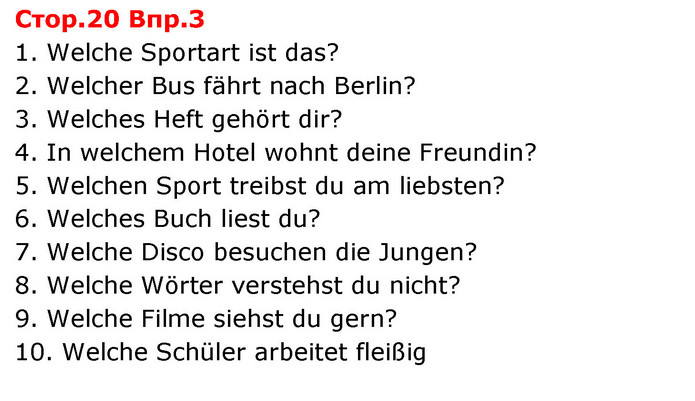 1. Welche Sportart ist das? 2. Welcher Bus fährt nach Berlin? 3. Welches Heft gehört dir? 4. In welchem Hotel wohnt deine Freundin? 5. Welchen Sport treibst du am liebsten? 6. Welches Buch liest du? 7. Welche Disco besuchen die Jungen? 8. Welche Wörter verstehst du nicht? 9. Welche Filme siehst du gern? 10. Welche Schüler arbeitet fleißig