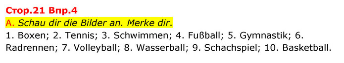 A. Schau dir die Bilder an. Merke dir. 1. Boxen; 2. Tennis; 3. Schwimmen; 4. Fußball; 5. Gymnastik; 6. Radrennen; 7. Volleyball; 8. Wasserball; 9. Schachspiel; 10. Basketball.