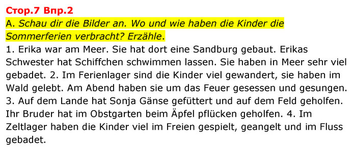 A. Schau dir die Bilder an. Wo und wie haben die Kinder die Sommerferien verbracht? Erzähle. 1. Erika war am Meer. Sie hat dort eine Sandburg gebaut. Erikas Schwester hat Schiffchen schwimmen lassen. Sie haben in Meer sehr viel gebadet. 2. Im Ferienlager sind die Kinder viel gewandert, sie haben im Wald gelebt. Am Abend haben sie um das Feuer gesessen und gesungen. 3. Auf dem Lande hat Sonja Gänse gefüttert und auf dem Feld geholfen. Ihr Bruder hat im Obstgarten beim Äpfel pflücken geholfen. 4. Im Zeltlager haben die Kinder viel im Freien gespielt, geangelt und im Fluss gebadet.
