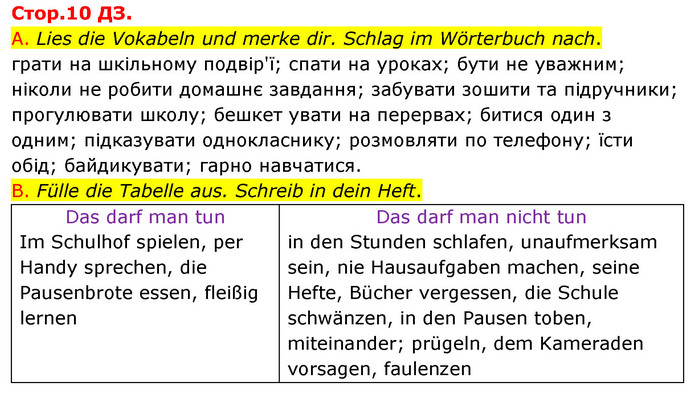 A. Lies die Vokabeln und merke dir. Schlag im Wörterbuch nach. грати на шкільному подвір'ї; спати на уроках; бути не уважним; ніколи не робити домашнє завдання; забувати зошити та підручники; прогулювати школу; бешкет увати на перервах; битися один з одним; підказувати однокласнику; розмовляти по телефону; їсти обід; байдикувати; гарно навчатися. B. Fülle die Tabelle aus. Schreib in dein Heft. Das darf man tun Im Schulhof spielen, per Handy sprechen, die Pausenbrote essen, fleißig lernen Das darf man nicht tun in den Stunden schlafen, unaufmerksam sein, nie Hausaufgaben machen, seine Hefte, Bücher vergessen, die Schule schwänzen, in den Pausen toben, miteinander; prügeln, dem Kameraden vorsagen, faulenzen