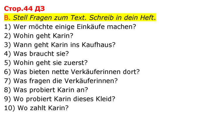 B. Stell Fragen zum Text. Schreib in dein Heft. 1) Wer möchte einige Einkäufe machen? 2) Wohin geht Karin? 3) Wann geht Karin ins Kaufhaus? 4) Was braucht sie? 5) Wohin geht sie zuerst? 6) Was bieten nette Verkäuferinnen dort? 7) Was fragen die Verkäuferinnen? 8) Was probiert Karin an? 9) Wo probiert Karin dieses Kleid? 10) Wo zahlt Karin?