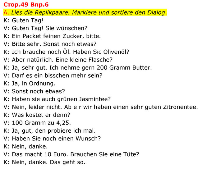 A. Lies die Replikpaare. Markiere und sortiere den Dialog. K: Guten Tag! V: Guten Tag! Sie wünschen? K: Ein Packet feinen Zucker, bitte. V: Bitte sehr. Sonst noch etwas? K: Ich brauche noch Öl. Haben Sic Olivenöl? V: Aber natürlich. Eine kleine Flasche? K: Ja, sehr gut. Ich nehme gern 200 Gramm Butter. V: Darf es ein bisschen mehr sein? K: Ja, in Ordnung. V: Sonst noch etwas? K: Haben sie auch grünen Jasmintee? V: Nein, leider nicht. Ab e r wir haben einen sehr guten Zitronentee. K: Was kostet er denn? V: 100 Gramm zu 4,25. K: Ja, gut, den probiere ich mal. V: Haben Sie noch einen Wunsch? K: Nein, danke. V: Das macht 10 Euro. Brauchen Sie eine Tüte? K: Nein, danke. Das geht so.