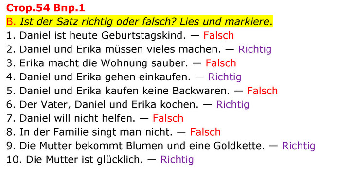 B. Ist der Satz richtig oder falsch? Lies und markiere. 1. Daniel ist heute Geburtstagskind. — Falsch 2. Daniel und Erika müssen vieles machen. — Richtig 3. Erika macht die Wohnung sauber. — Falsch 4. Daniel und Erika gehen einkaufen. — Richtig 5. Daniel und Erika kaufen keine Backwaren. — Falsch 6. Der Vater, Daniel und Erika kochen. — Richtig 7. Daniel will nicht helfen. — Falsch 8. In der Familie singt man nicht. — Falsch 9. Die Mutter bekommt Blumen und eine Goldkette. — Richtig 10. Die Mutter ist glücklich. — Richtig