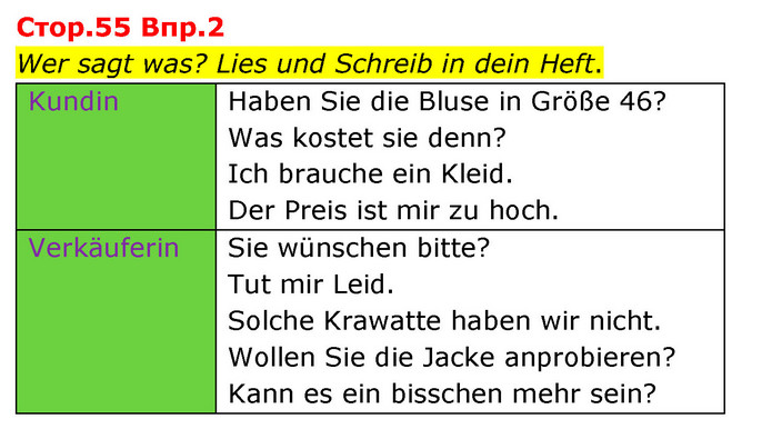 Wer sagt was? Lies und Schreib in dein Heft. Kundin Haben Sie die Bluse in Größe 46? Was kostet sie denn? Ich brauche ein Kleid. Der Preis ist mir zu hoch. Verkäuferin Sie wünschen bitte? Tut mir Leid. Solche Krawatte haben wir nicht. Wollen Sie die Jacke anprobieren? Kann es ein bisschen mehr sein?