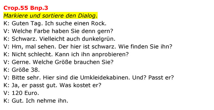 Markiere und sortiere den Dialog. K: Guten Tag. Ich suche einen Rock. V: Welche Farbe haben Sie denn gern? K: Schwarz. Vielleicht auch dunkelgrün. V: Hm, mal sehen. Der hier ist schwarz. Wie finden Sie ihn? K: Nicht schlecht. Kann ich ihn anprobieren? V: Gerne. Welche Größe brauchen Sie? K: Größe 38. V: Bitte sehr. Hier sind die Umkleidekabinen. Und? Passt er? K: Ja, er passt gut. Was kostet er? V: 120 Euro. K: Gut. Ich nehme ihn.
