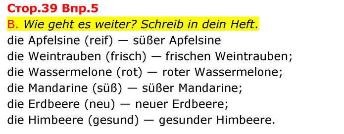 B. Wie geht es weiter? Schreib in dein Heft. die Apfelsine (reif) — süßer Apfelsine die Weintrauben (frisch) — frischen Weintrauben; die Wassermelone (rot) — roter Wassermelone; die Mandarine (süß) — süßer Mandarine; die Erdbeere (neu) — neuer Erdbeere; die Himbeere (gesund) — gesunder Himbeere.
