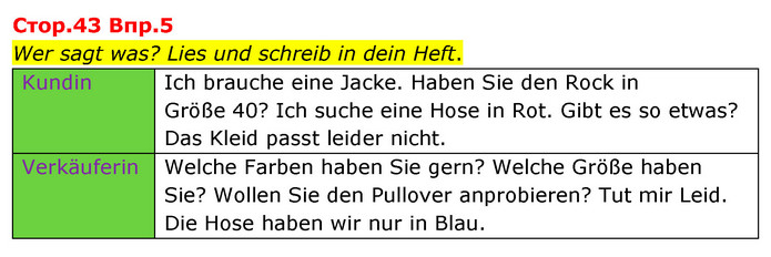 Wer sagt was? Lies und schreib in dein Heft. Kundin Ich brauche eine Jacke. Haben Sie den Rock in Größe 40? Ich suche eine Hose in Rot. Gibt es so etwas? Das Kleid passt leider nicht. Verkäuferin Welche Farben haben Sie gern? Welche Größe haben Sie? Wollen Sie den Pullover anprobieren? Tut mir Leid. Die Hose haben wir nur in Blau.