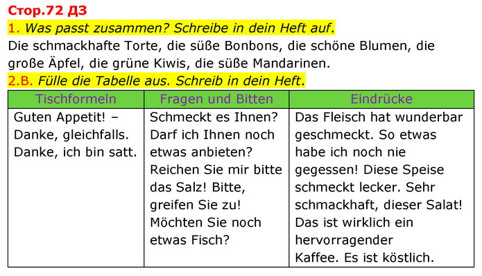 1. Was passt zusammen? Schreibe in dein Heft auf. Die schmackhafte Torte, die süße Bonbons, die schöne Blumen, die große Äpfel, die grüne Kiwis, die süße Mandarinen. 2.B. Fülle die Tabelle aus. Schreib in dein Heft. Tischformeln Fragen und Bitten Eindrücke Guten Appetit! – Danke, gleichfalls. Danke, ich bin satt. Schmeckt es Ihnen? Darf ich Ihnen noch etwas anbieten? Reichen Sie mir bitte das Salz! Bitte, greifen Sie zu! Möchten Sie noch etwas Fisch? Das Fleisch hat wunderbar geschmeckt. So etwas habe ich noch nie gegessen! Diese Speise schmeckt lecker. Sehr schmackhaft, dieser Salat! Das ist wirklich ein hervorragender Kaffee. Es ist köstlich.