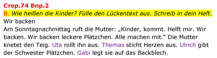 B. Wie heißen die Kinder? Fülle den Lückentext aus. Schreib in dein Heft. Wir backen Am Sonntagnachmittag ruft die Mutter: „Kinder, kommt. Helft mir. Wir backen. Wir backen leckere Plätzchen. Alle machen mit.“ Die Mutter knetet den Teig. Uta rollt ihn aus. Thomas sticht Herzen aus. Ulrich gibt der Schwester Plätzchen. Gabi legt sie auf das Backblech.