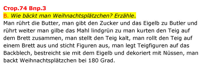 B. Wie bäckt man Weihnachtsplätzchen? Erzähle. Man rührt die Butter, man gibt den Zucker und das Eigelb zu Butler und rührt weiter man gilbe das Mahl lindgrün zu man kurten den Teig auf dem Brett zusammen, man stellt den Teig kalt, man rollt den Teig auf einem Brett aus und sticht Figuren aus, man legt Teigfiguren auf das Backblech, bestreicht sie mit dem Eigelb und dekoriert mit Nüssen, man backt Weihnachtsplätzchen bei 180 Grad.
