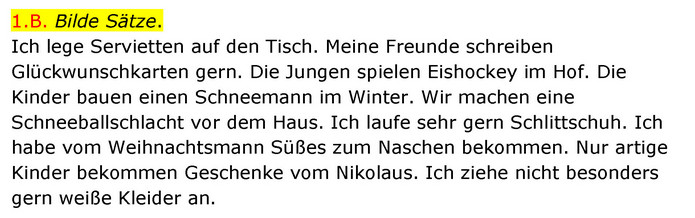 1.B. Bilde Sätze. Ich lege Servietten auf den Tisch. Meine Freunde schreiben Glückwunschkarten gern. Die Jungen spielen Eishockey im Hof. Die Kinder bauen einen Schneemann im Winter. Wir machen eine Schneeballschlacht vor dem Haus. Ich laufe sehr gern Schlittschuh. Ich habe vom Weihnachtsmann Süßes zum Naschen bekommen. Nur artige Kinder bekommen Geschenke vom Nikolaus. Ich ziehe nicht besonders gern weiße Kleider an.
