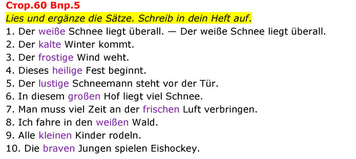 Lies und ergänze die Sätze. Schreib in dein Heft auf. 1. Der weiße Schnee liegt überall. — Der weiße Schnee liegt überall. 2. Der kalte Winter kommt. 3. Der frostige Wind weht. 4. Dieses heilige Fest beginnt. 5. Der lustige Schneemann steht vor der Tür. 6. In diesem großen Hof liegt viel Schnee. 7. Man muss viel Zeit an der frischen Luft verbringen. 8. Ich fahre in den weißen Wald. 9. Alle kleinen Kinder rodeln. 10. Die braven Jungen spielen Eishockey.